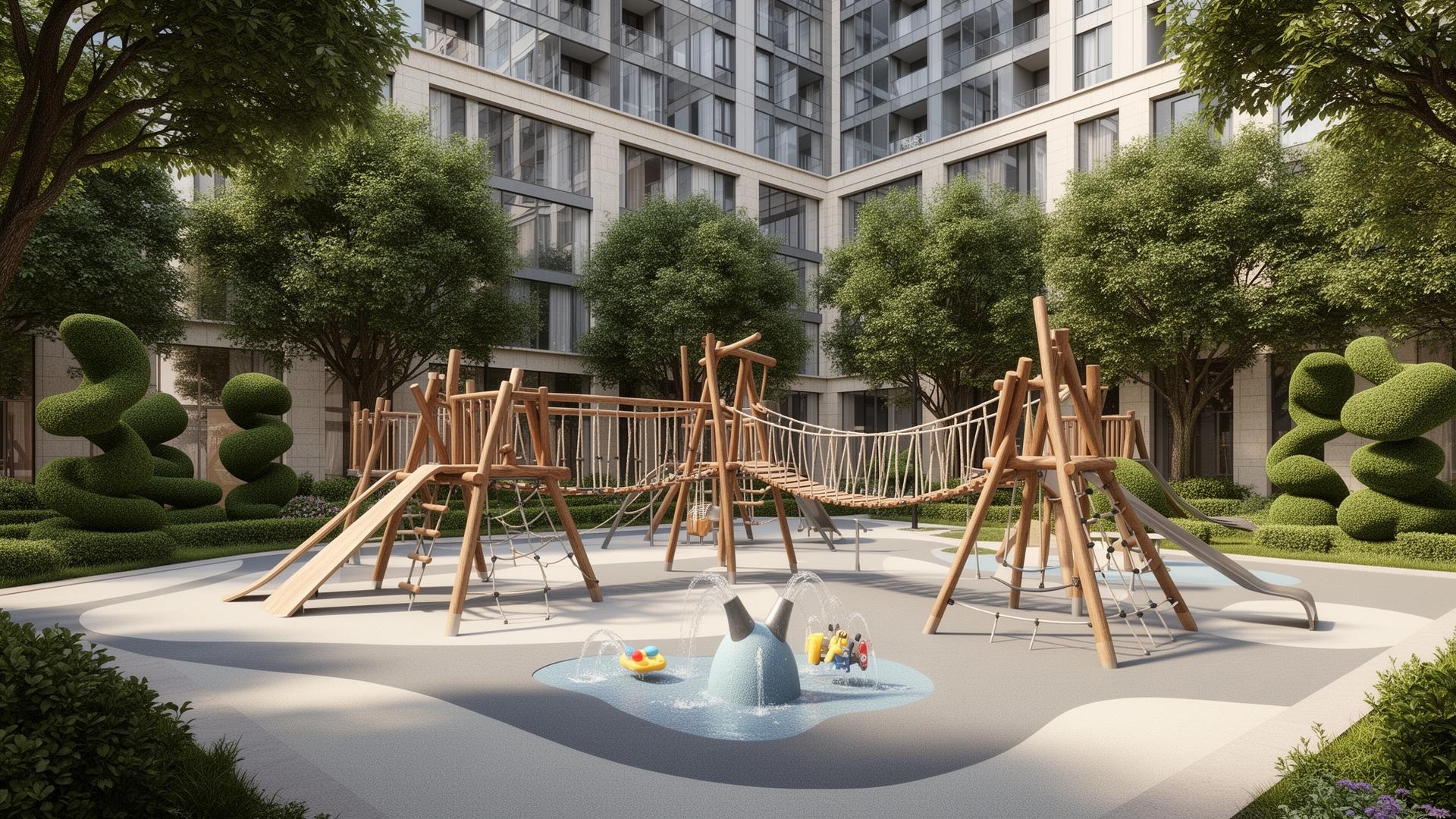 Современные детские площадки с безопасным покрытием для разных возрастных групп. Плейхаб с интерактивными игровыми элементами по европейским стандартам.