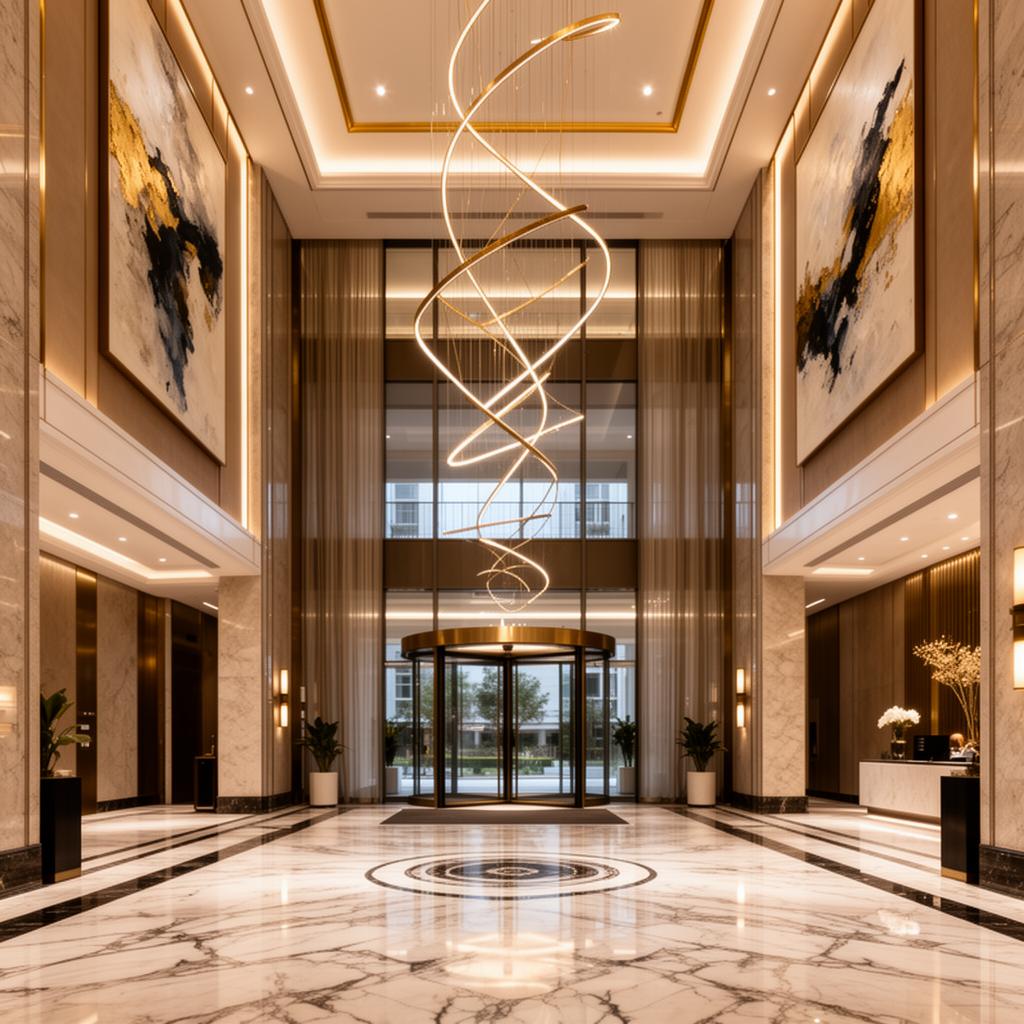 Входные группы с мраморной отделкой, авторскими светильниками и арт-объектами. Консьерж-сервис, зона ожидания. Высота потолков в лобби — до 5 метров.